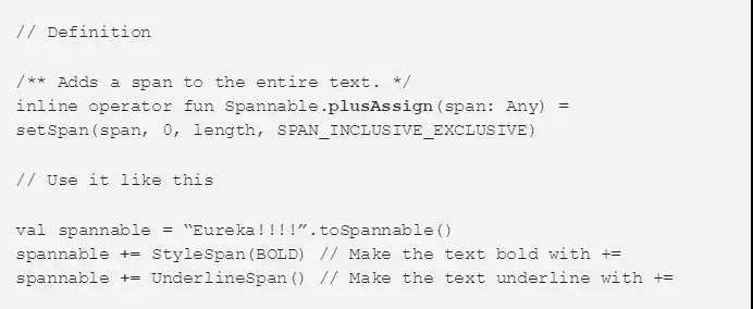 用操作符重载快更快速写 Kotlin。像 Path,Range或 SpannableStrings 这样的对象允许像加法或减法这样的操作。通过 Kotlin,您可以实现自己的操作符。