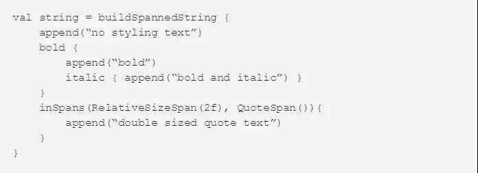 功能强大但很难使用 - 这就是 Spans API 感觉的文本样式。 Android KTX 为一些最常见的 span 添加了扩展功能,并使 API 更易于使用。Android KTX: 可跨越字符串的构建器