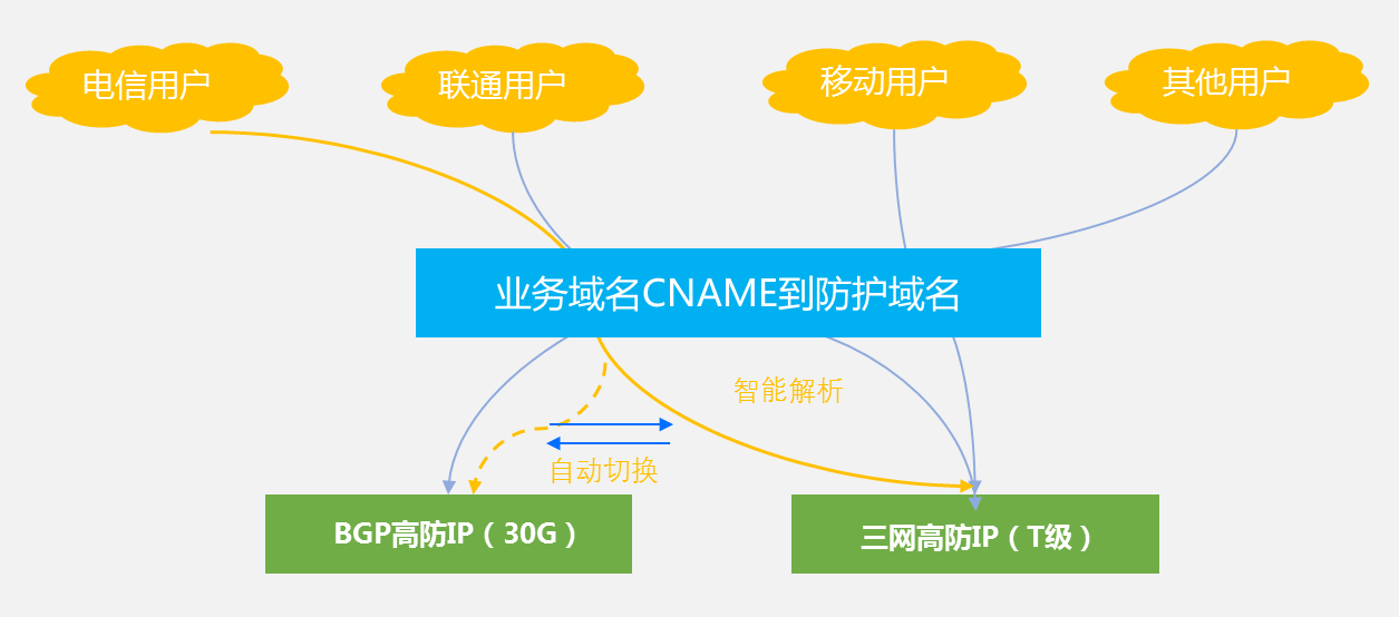 防护域名提供智能解析和自动切换的能力。 在同时具备包括BGP的多线路防护资源时,优先解析到BGP;若发生攻击导致BGP线路被封禁,系统会自动切换到三网防护资源,此时会根据访问者的来源IP自动解析到对应的运营商线路,从而尽可能的保证最优的延迟;