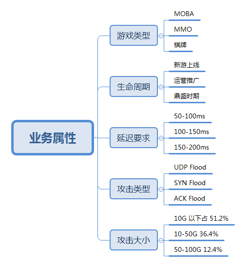 鉴于游戏业务面临日益严峻的安全攻击风险,我们有必要对其进行进一步的剖析,为后续建立相应的安全防护打好基础。游戏安全场景由两部分要素组成。一部分是业务属性,另一部分是技术和部署架构;业务属性包括了游戏类型、攻击趋势、延迟要求等,决定了被DDoS的概率、攻击流量的大小,需要使用什么类型的防护资源,如BGP还是三大运营商的单线线路;技术和部署架构,包括使用的通信协议、部署架构等,决定了需要使用什么防护产品来对抗。