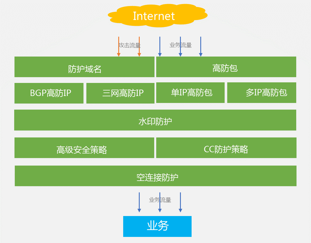 防护方案整体上可以采用防护域名+ BGP 高防IP + 三网高防 IP + 高防IP 灵活调度的策略。第一层防护,使用BGP高防IP防护中小流量,并且作为业务对外正常服务的入口;第二层防护,使用三网高防或BGP高防IP灵活调度来防护、三网高防作为保底措施;第三层,若攻击报文有长度、内容特征,可以使用自定义防护策略,过滤这些报文;第四层,若有明显CC攻击,默认的空连接防护以及紧急防护模式(更严格的过滤策略),可以帮助业务正常提供服务,也可以在研发或上线后逐步接入水印防护,100%有效防护CC攻击。