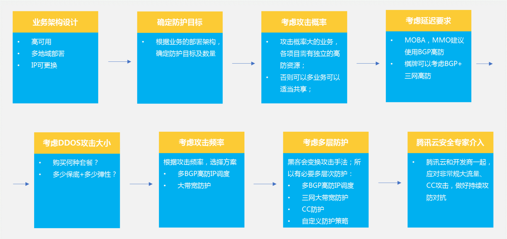 在防护业务时,两个方面需要考虑,一个是防住攻击,第二是尽量不影响玩家体验。能否防住攻击,与高防产品技术、架构和资源有关,后续再深入介绍。为了不影响玩家体验,建议网络延迟不要增加至超过上述延迟的上限。又因网络延迟主要和网络线路质量有关,故建议MOBA,MMO使用BGP线路的防护资源;棋类游戏可以使用BGP(常态下业务访问+基础防护)+三网(大流量下防护)的组合防护资源。