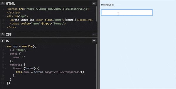 <input :value="name" @input="name = $event.target.value">