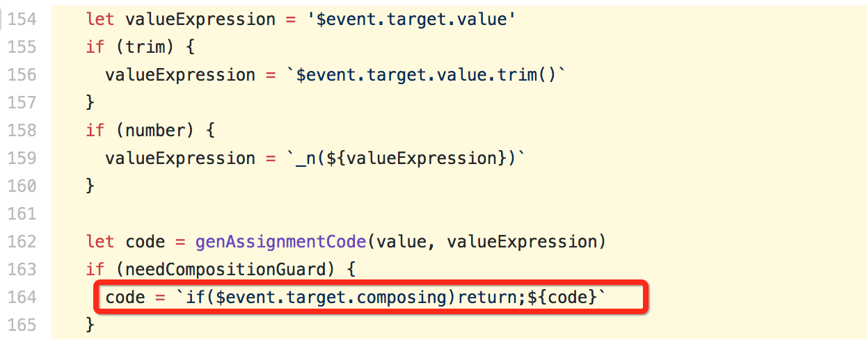 - 如果你感兴趣的话,可以修改 vue.js 的源代码,将 shouldUpdateValue 函数里对 composing 属性的判断去掉,可以看到输入法又跟之前一样异常了