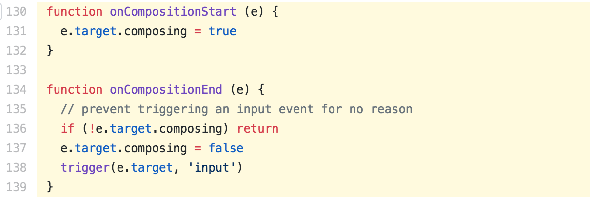 那么,是什么地方调用了这2个函数呢?可以看到,在插入dom节点时,vue.js 监听了 compositionstart / compositionend 事件: