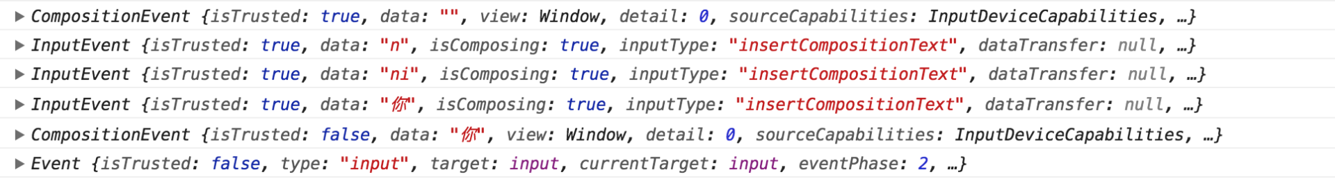 compositionstart => 3个 input => compositionend 事件,这些都是<input>控件触发的。最后一个 input 事件,是源代码里面看到的 onCompositionEnd 回调里面 vue.js 触发的。