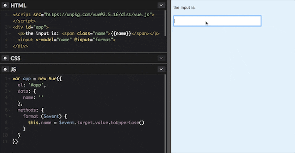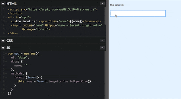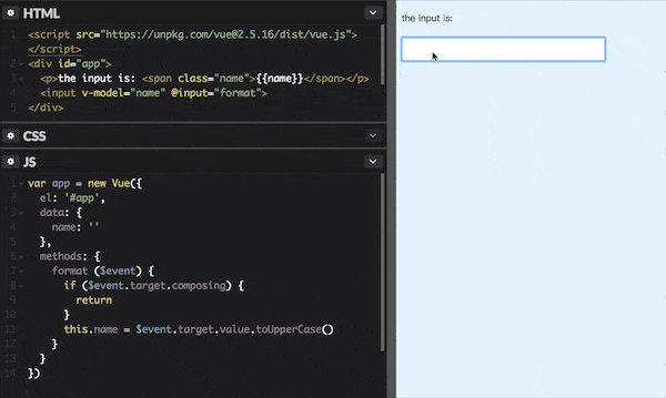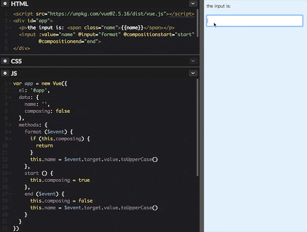 再次看下文章开头的示例,如果使用 v-model 指令实现数据双向绑定,就不会出现输入法异常,如下图所示,也可以在线尝试: