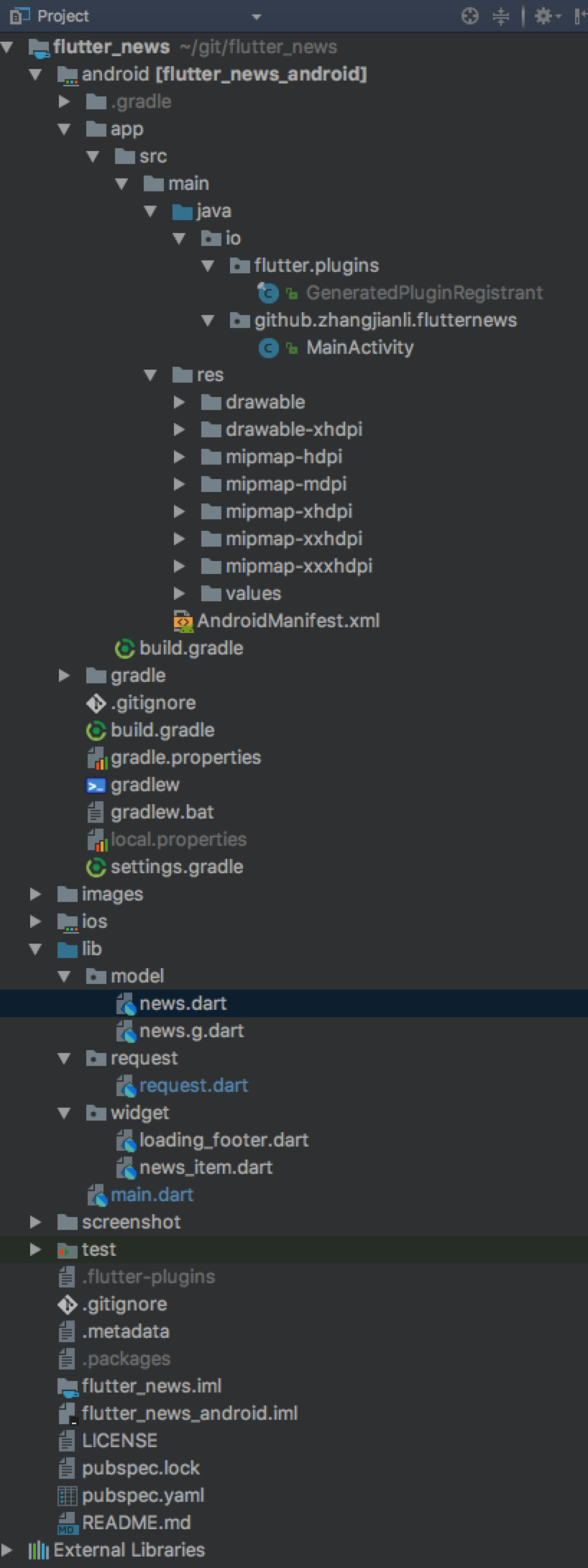 为了学习Flutter, 我试着开发了一个简单的新闻app,涵盖了一些移动端app比较基础的功能。接下来我会对照这个app来给大家介绍一下Flutter开发的一些知识。整个工程源码大家可以从Github获取。如有任何问题或建议,欢迎大家提issue。
