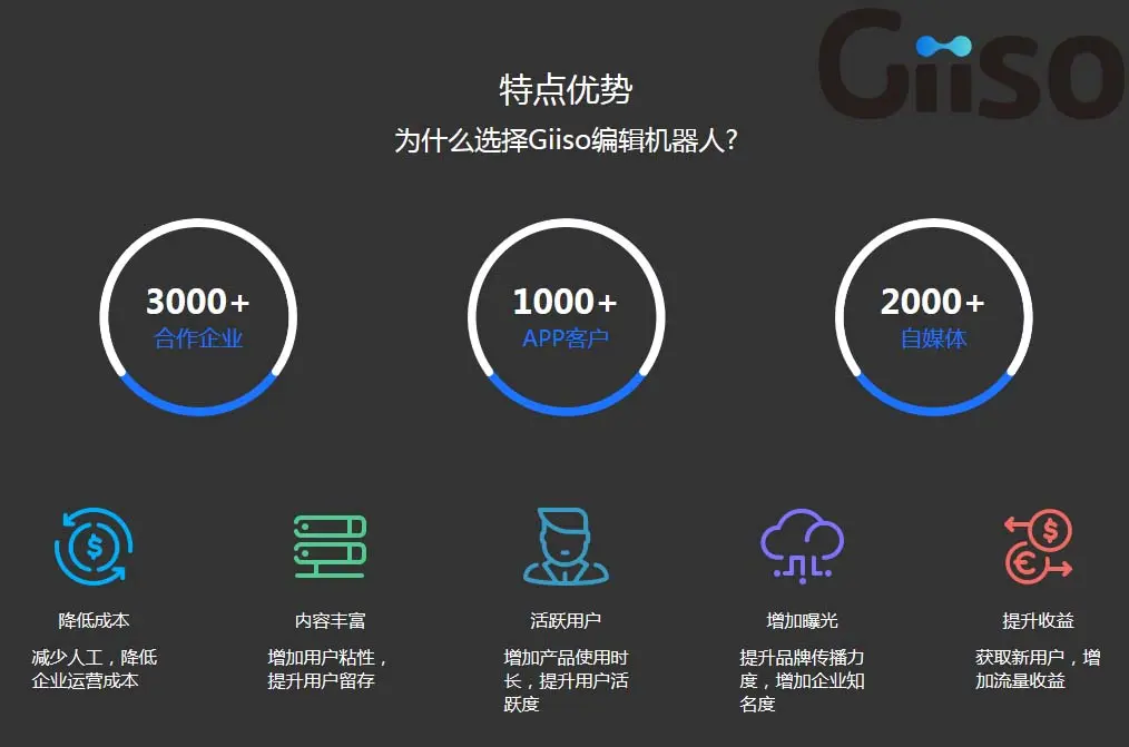 智搜(Giiso)科技成立于2013年,是国内首家专注于资讯智能处理技术研发及资讯机器人核心软件开发和运营的高科技企业。公司成立之初,就获得了天使轮投资,并在2015年8月获得了金沙江创投500万美元pre-A轮投资。 编辑机器人就是通过AI技术来智能化提供文本的分类、分词、关键词提取等工作,极大提高文本处理效率。 智能化的资讯频道定制服务专家,无需人工编辑,资讯内容自动化生成。 助力资讯运营“无人化编辑”,实现内容的7*24小时实时更新,是企业内容运营的好帮手。