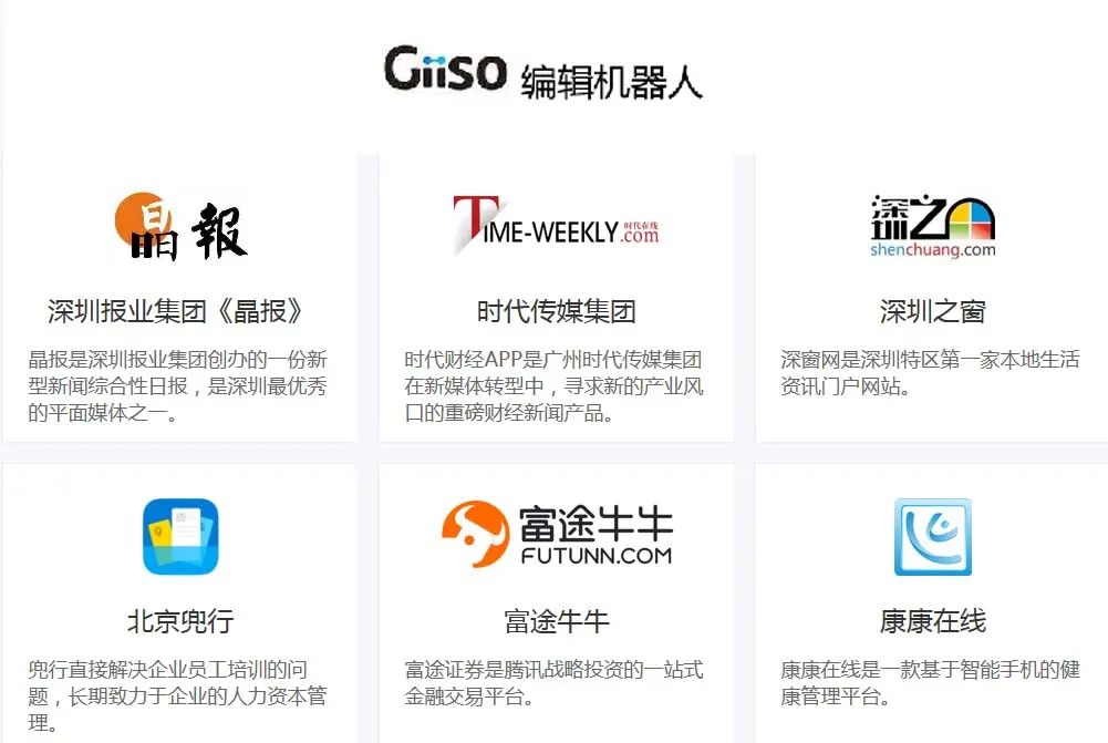 Giiso智搜之所以能够获得投资家的青睐,这和公司一流的科研与技术研发团队分不开。Giiso集结了来自清华大学、北京大学、国防科技大学等高校的博士、研究生,国际化的科研团队,使得Giiso在人工智能领域不可小觑。 公司完全自主研发了Giiso资讯机器人引擎,以及系列衍生的智能编辑机器人产品,可广泛应用于新闻媒体服务和情报采集追踪领域。而且由Giiso团队自主研发的编辑机器人已经可以实现对资讯内容的全自动智能化采编,提高了资讯的采集、加工、分析处理效率,在此基础上,机器人还可通过机器学习实现智慧的自我持续进化能力。据悉,包括东莞报业集团、深圳之窗、广州日报、南方报业在内的多家权威媒体已相继与智搜公司展开合作。