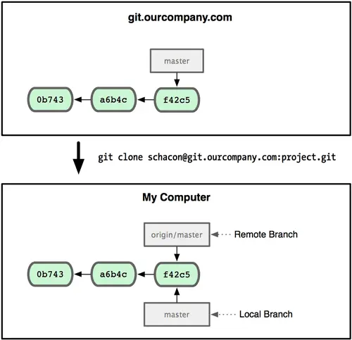 执行完此命令后,Git会自动为你将远程仓库命名为origin,并下载其中所有的数据到本地,在本地建立所有远程存在的分支,并且命名为origin/xxx,例如远程分支有master、developer,那么本地就会建立origin/master分支、origin/developer分支,并且它们都是处于remotes目录下,是隐藏的。使用命令git branch -a就可以看到隐藏目录remotes,结果显示为remotes/origin/master以及remotes/origin/developer。接着,Git会继续建立一个属于你的本地master和developer分支,位置和远程origin/master、origin/developer分支处于相同的位置,你就可以开始工作了。 这样,我们在本地仓库的本地分支和远程分支就都有了,并且始于同一位置。