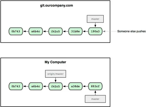 如果其他人向github上xxx推送了他们的更新,那么服务器上的相应分支就会向前推进。如果在本地的相应分支进行了commit提交到本地代码库,那么本地的master或者developer分支也会向前推进,不过只要你不和服务器通信数据,那么本地的remotes/origin/master(developer)指针仍然会在原地不动。