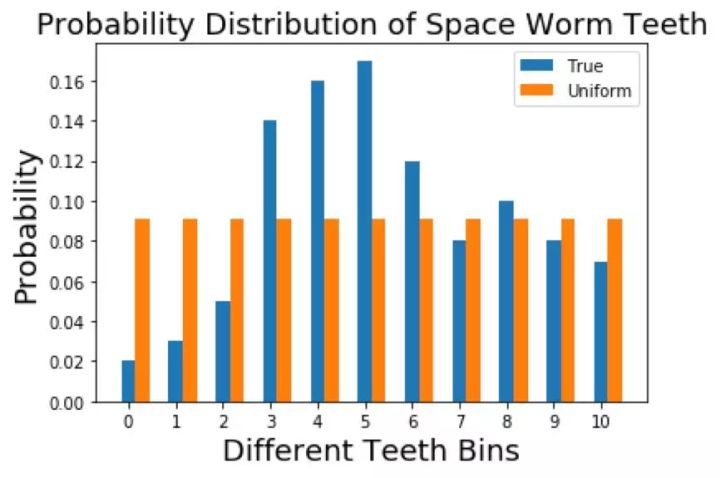 上述博文中所解决的核心问题是这样的:假设我们是一组正在广袤无垠的太空中进行研究的科学家。我们发现了一些太空蠕虫,这些太空蠕虫的牙齿数量各不相同。现在我们需要将这些信息发回地球。但从太空向地球发送信息的成本很高,所以我们需要用尽量少的数据表达这些信息。我们有个好方法:我们不发送单个数值,而是绘制一张图表,其中 X 轴表示所观察到的不同牙齿数量(0,1,2…),Y 轴是看到的太空蠕虫具有 x 颗牙齿的概率(即具有 x 颗牙齿的蠕虫数量/蠕虫总数量)。这样,我们就将观察结果转换成了分布。