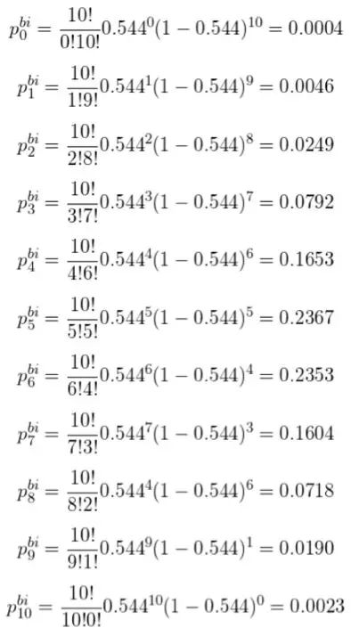 - 二项分布——n=10、p=0.544,k 取值在 0 到 10 之间。