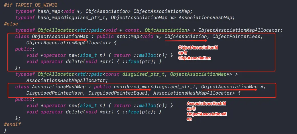 从unordered_map源码中我们可以看出_Key和_Tp也就是前两个参数对应着map中的Key和Value,那么对照上面AssociationsHashMap内源码发现_Key中传入的是disguised_ptr_t,_Tp中传入的值则为ObjectAssociationMap*。