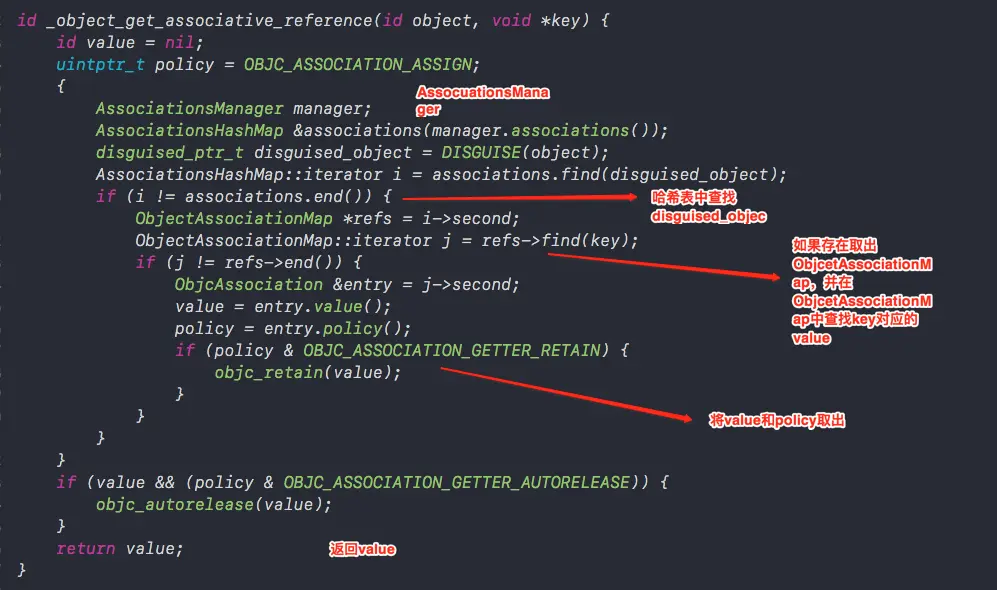从_object_get_associative_reference函数内部可以看出,向set方法中那样,反向将value一层一层取出最后return出去。