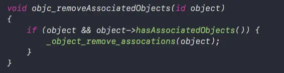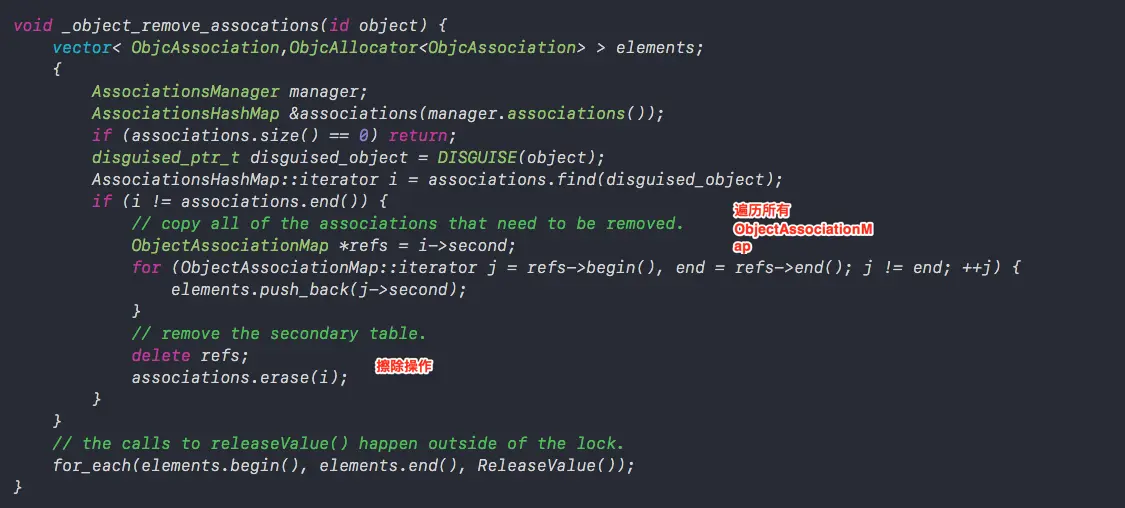 objc_removeAssociatedObjects用来删除所有的关联对象,objc_removeAssociatedObjects函数内部调用的是_object_remove_assocations函数