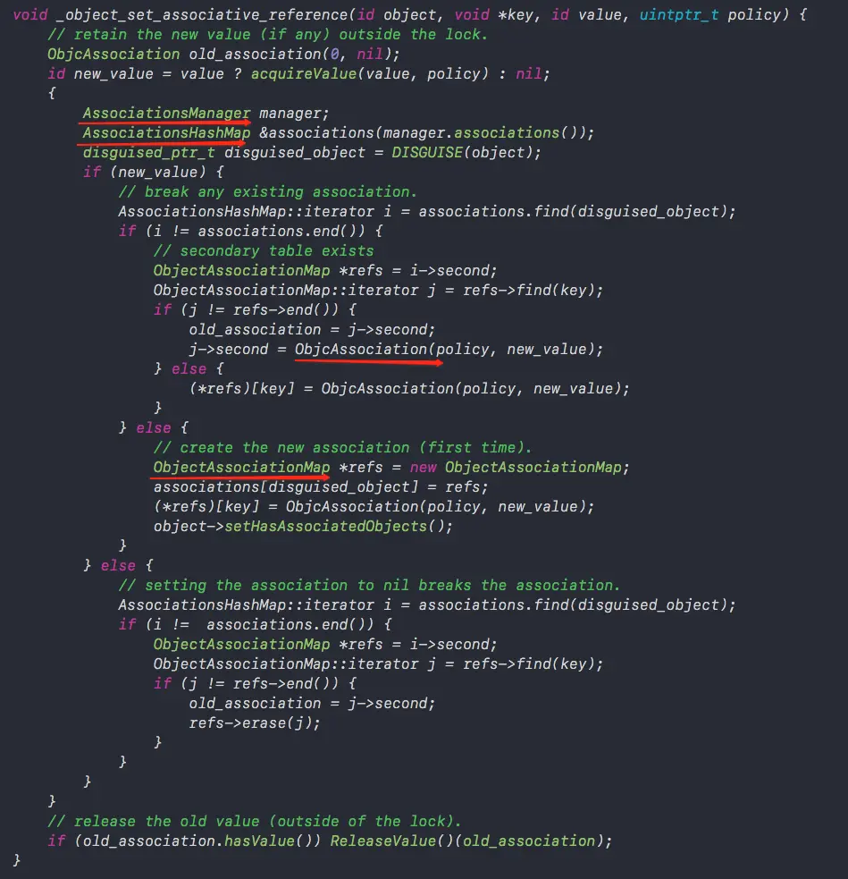 _object_set_associative_reference函数内部我们可以全部找到我们上面说过的实现关联对象技术的核心对象。接下来我们来一个一个看其内部实现原理探寻他们之间的关系。