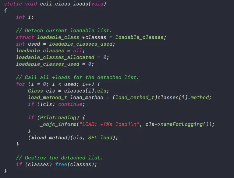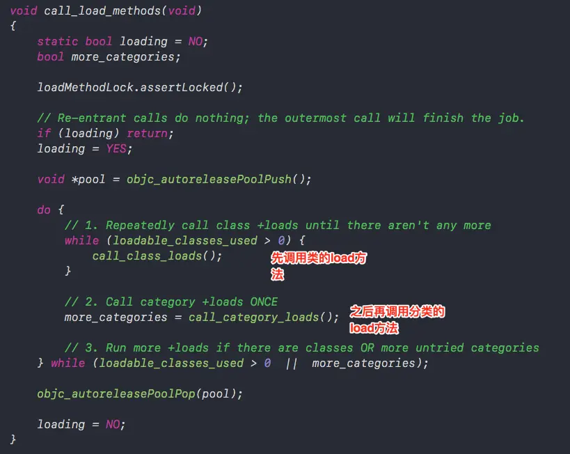 我们看到load方法中直接拿到load方法的内存地址直接调用方法,不在是通过消息发送机制调用