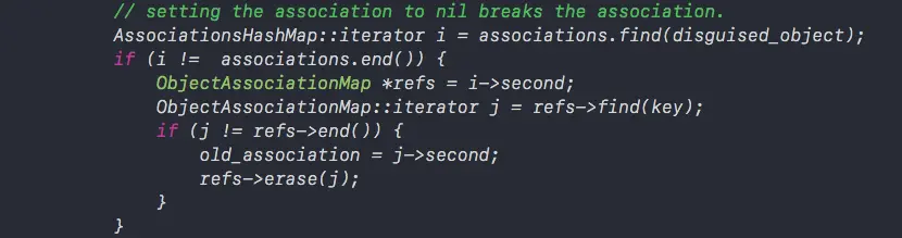从上述代码中可以看出,如果我们设置value为nil时,就会将关联对象从ObjectAssociationMap中移除。