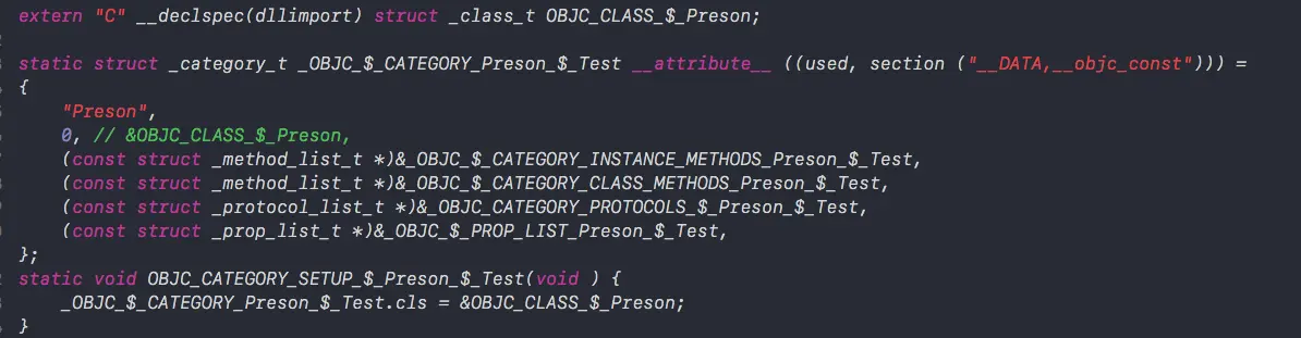 } _OBJC_$_CATEGORY_INSTANCE_METHODS_Person_$_Test __attribute__ ((used, section ("__DATA,__objc_const"))) = {