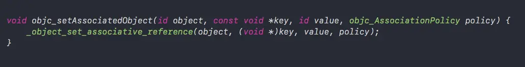 objc_setAssociatedObject(id object, const void *key, id value, objc_AssociationPolicy policy);