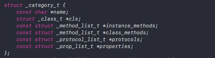 通过以上分析我们发现。分类源码中确实是将我们定义的对象方法,类方法,属性等都存放在catagory_t结构体中。通过 runtime 源码查看catagory_t存储的方法,属性,协议等我们得知,分类的实现原理是将category中的方法,属性,协议数据放在category_t结构体中,然后将结构体内的方法列表拷贝到类对象的方法列表中。