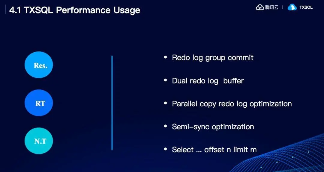 我们会通过在压测过程中比较他们资源竞争的情况,比如说内存资源或锁资源,下图中的前三个是我们对redo log所做的性能调优,第一个是redo log,通过减少sync 盘的次数来提升性能,第二部分是通过多缓冲buffer,即Redo Log 在Sync的同时不影响其它事务日志的写入,第三个则可以保证事务在向系统缓冲区写Redo 日志时互不影响,提升并发性。Select offset limit 操作则是将计算下推到引擎层,降低 CPU资源消耗的同时,提升性能。
