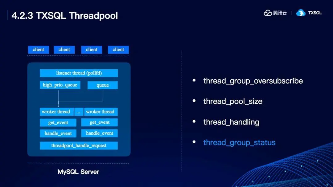 第三个是thread handling,我们在测试压力测试的时候,随着并发的加大,性能会首先提升,然后下降,原因则是系统内部各种资源的竟争比较严重,TXSQL 通过把 Thread Pool 引入来解决这个问题,并且解决了以下几个问题: