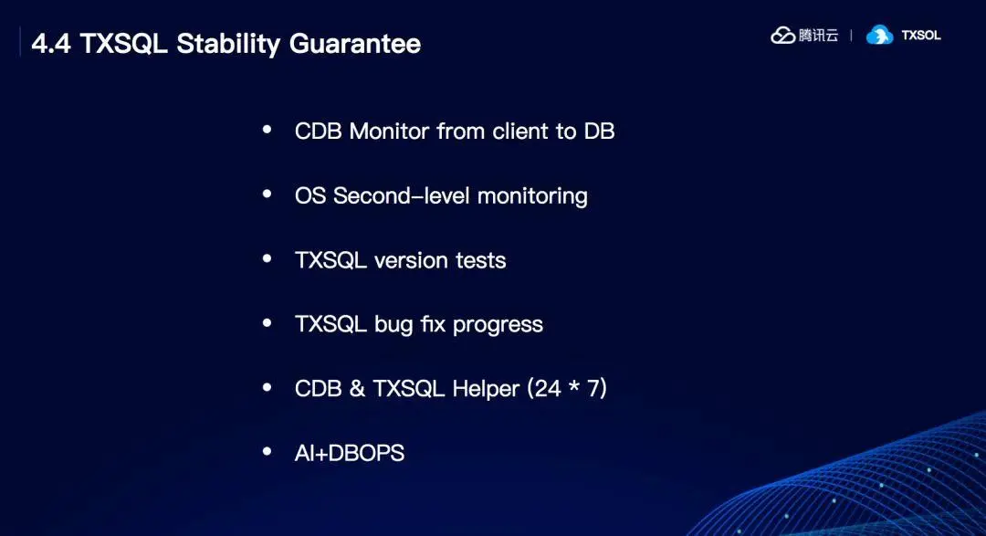 TXSQL只是作为内核版本来帮助用户进行计算。我们的稳定性有几个来保证,一个是全链路监控,一个是机器层面操作系统方面的监控,还有MySQL的秒级监控,以及人工的在线帮助。