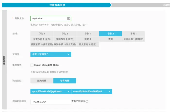 二、输入集群名称后,选择地域、可用区并选择网络模式,推荐专有网络