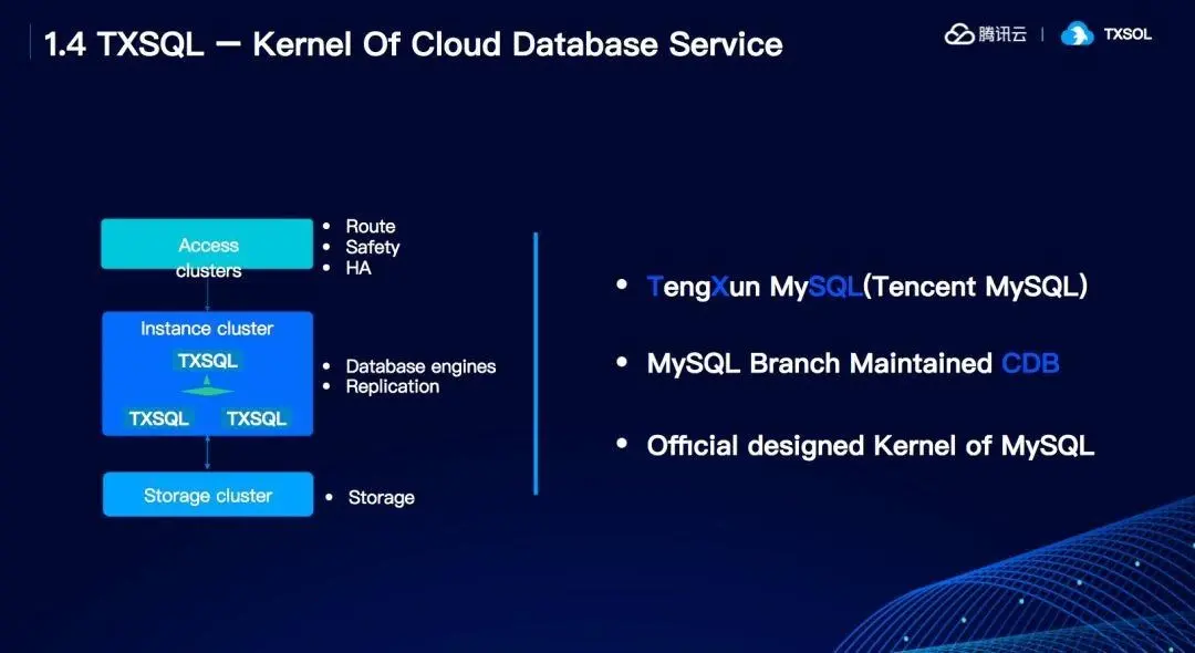 CDB服务目前分为本地盘和网盘,TXSQL是基础架构部数据库内核团队独立维护的MySQL 分支,对外通过CDB服务提供给客户。可以看到TXSQL是内核,也是底层提供数据服务的位置。