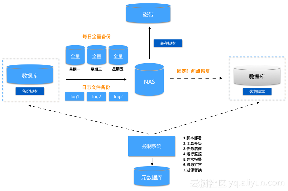 DBA脚本化管理,集成mysqldump、mongodump等备份工具,周期性将数据文件和日志文件备份到NAS等存储设备,再定期将备份集转存到磁带做长期归档。通过配置文件来控制备份启停和运行时间,备份脚本上报运行状态到元数据库,控制系统再根据元数据库信息触发报警。数据恢复时,借助元数据库记录的备份集时间、保留时长、存储位置等信息,检索故障前最新备份时间点,确定对应备份集是否存在,如果存在,手工或脚本获取备份集,准备恢复环境,并执行脚本恢复数据库。