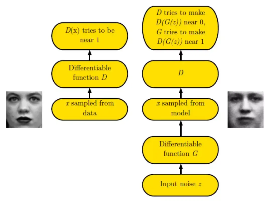 上图中,对于真实的采样数据,通过判别网络后,生成 D(x)。D(x) 的输出是 0-1 范围内的一个实数,用来判断这个图片是一个真实图片的概率是多大。这样对于真实数据,D(x) 越接近 1 越好。对于随机噪声 z,通过生成网络 G 后,G 将这个随机噪声转化为生成数据 x。如果是图片生成问题,G 网络的输出就是一张生成的假图片,用 G(z) 表示。判别模型 D 要使得 D(G(z)) 接近与 0,即能够判断生成的图片是假的;生成模型 G 要使得 D(G(z)) 接近于 1,即要能够要欺骗判别模型,使得 D 认为 G(z) 生成的假数据是真的。这样通过判别模型 D 和生成模型 G 的博弈,使得 D 无法判断一张图片是生成出来的还是真实的而结束。
