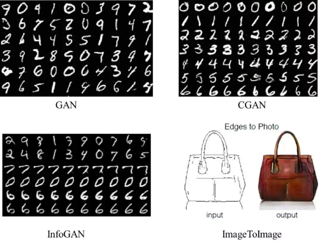 其中,原生 GAN 生成的 Mnist 图像不可控:CGAN 可按照数字标签生成相应标签的数字图像;InfoGAN 可认为是无监督的 CGAN,前两行表示用分类潜变量控制数字的生成类别,中间两行表示用连续型潜变量控制数字的粗细,最后两行表示用连续型潜变量控制数字的倾斜方向;ImageToImage 是 CGAN 的一种,实现图像的风格转换。