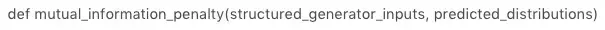 # InfoGan 的 Loss 值为在 GAN 的 loss 值上,加上互信息 I(c;G(z,c)),TFGAN 中提供了互信息计算的 API,如下所示。其中 structured_generator_inputs 为潜变量的噪音信息,predicted_distributions 为变分分布 Q(c|x)。