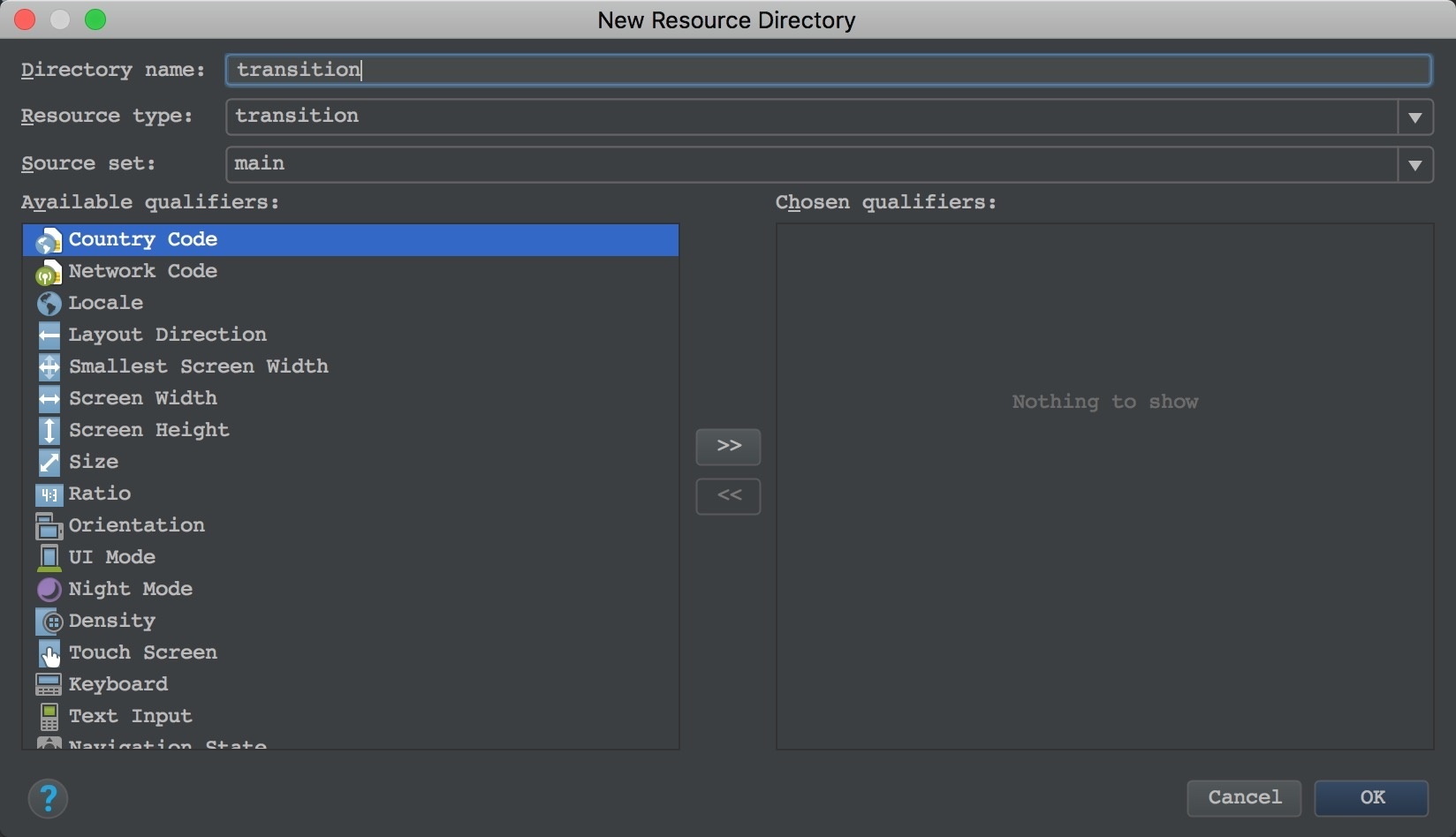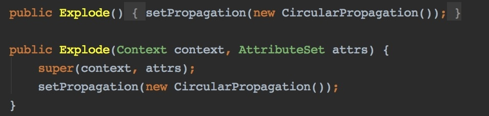 Propagation可以指定Transition中的视图过渡延迟, 控制进入当前场景的视图进入的先后顺序. 例如要求Explode动画中特定的View速度快于其他的视图.