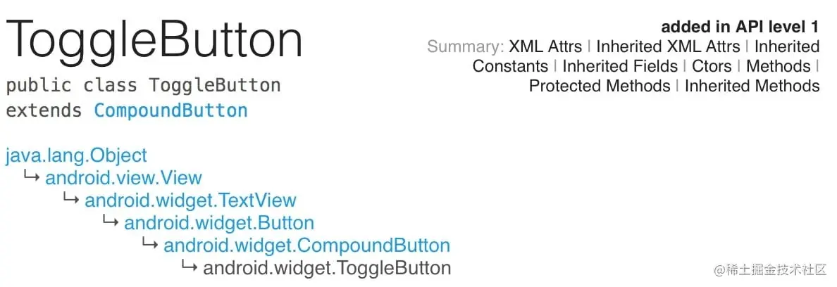 java.lang.Object ↳ android.view.View ↳ android.widget.TextView ↳ android.widget.Button ↳ android.widget.CompoundButton 直接继承CompoundButton的子类 CheckBox, RadioButton, Switch, SwitchCompat, ToggleButton