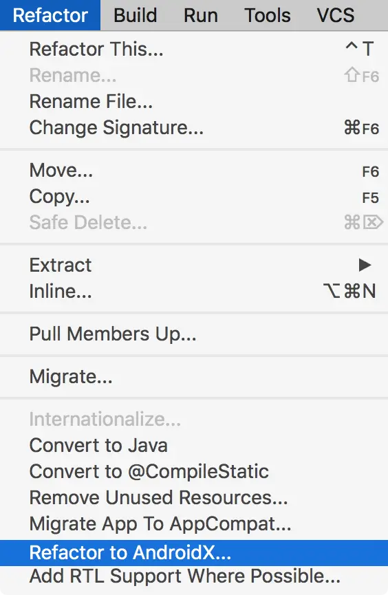 Android Studio 3.2 Canary 14及以上版本提供了更加方便快捷的方法一键重构到AndroidX。选择菜单上的ReFactor->Refactor to AndroidX...即可: