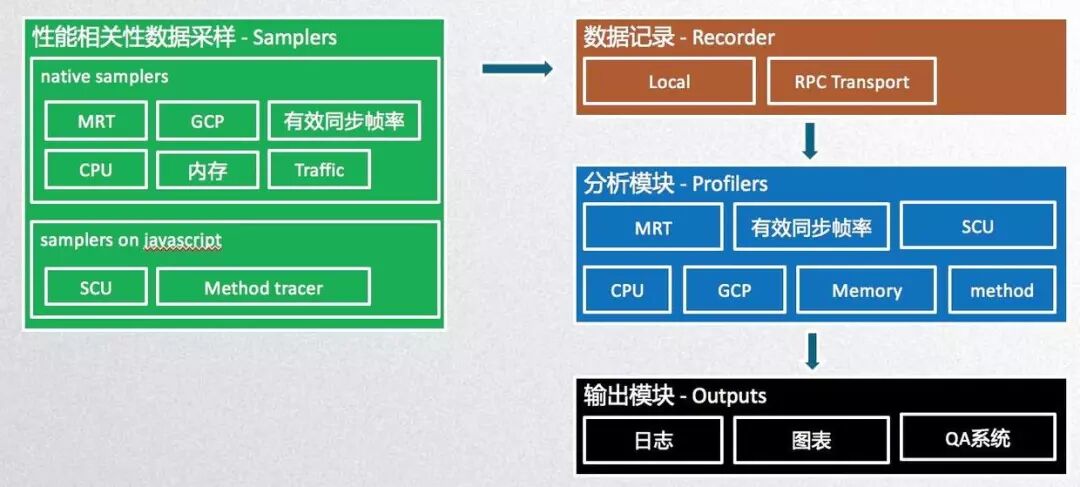 首先是性能相关性数据的实时采样模块,包括 MRT (消息响应及时性)、 GCP (绘图指令生效推迟)、逻辑同步帧率等。 其次是对样本的记录,记录模块目前支持两种记录模式,一种是存储在手机本地,一种是提供外放协议可以把数据投递到外部对接系统。 之后是实时分析,基于记录的各个维度数据进行缺陷侦测并生成预警。通过输出模块输出到开发者日志和可视化报表,这里我们后期有计划自动生成对应项目的性能 bug 对接到 QA 系统。