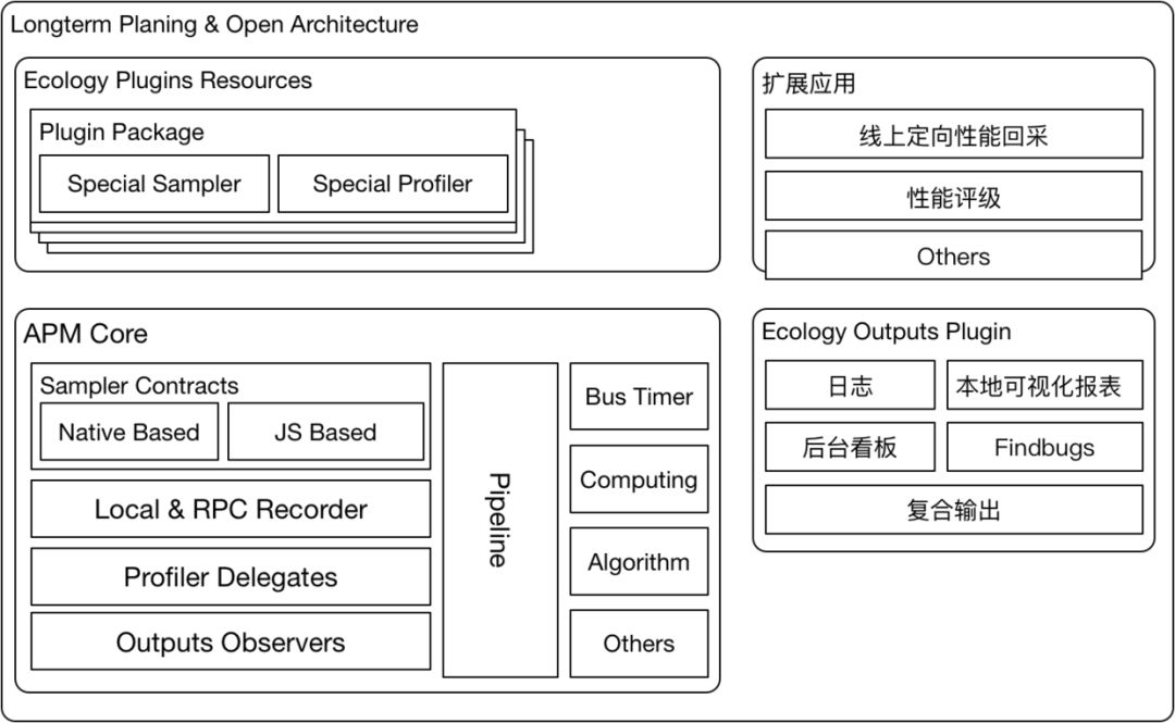 开放式架构:将流程、设计约定、基础功能和算法抽离为轻便的 APM Core ,把具体的 sampler 和 profiler 和 output 作为其上的插件实现进行剥离,各业务线团队和开发者根据自身需要定制、扩展性能维度和分析规则。
