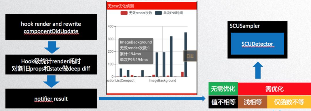 SCU 优化(shouldComponentUpdate optimization)是在 reactjs/react native 中经常强调的一个调优项。我们通过 hook 组件的 componentDidUpdate 对先后的 props 和 state 做 deepdiff ,根据结果分为深比较值不等、深比较仅函数不等、浅比较为开发者提供优化建议。在反馈报表中可以清晰感知到哪些组件发生了冗余的 render 以及优化收益预估。