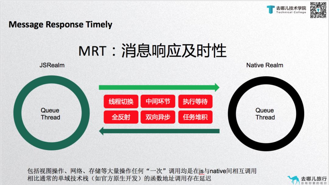 抛开具体实现, React Native 中 Native 域与 JS 域互操作的最简化模型如下,两边各有一个基于消息队列模型的线程, js 侧这个线程就是 javascript 代码执行的线程, native 侧是 nativemodulethread 用来执行 js 测投递过来的 NativeModule 调用。两侧的互操作是基于 jni 向对方投递消息,不同于大多数原生开发的单域仅是内存地址对应的代码块,因为涉及到线程切换、反射、任务队列、双向异步,这个过程并没有那么及时,尤其涉及到视图频繁变更、手势事件传递这些场景下相对原生方案延迟还是蛮大的。