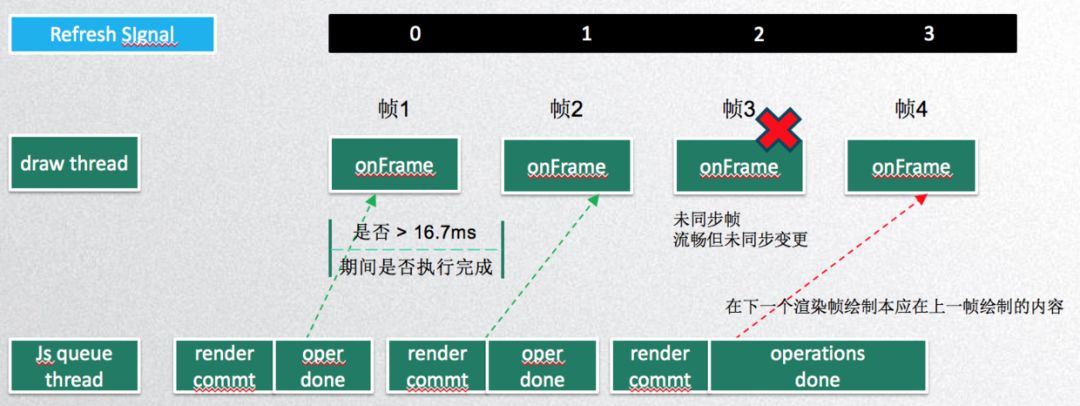 React Native 的实际渲染执行和视图属性计算声明是彼此异步进行,以往针对原生应用的帧率监控指标在 RN 应用下会非常“好看”,几乎不可能出现 ANR ,极少会掉帧。但事实是 js 域的每次 render 执行并不是实时生效到实际界面上, js 域上的视图数据计算和属性配置成为瓶颈。以安卓为例我们通过 VSYNC 特性在每两帧间检查是否发生 JSInstance.onBatchCompleted 视图操作事务提交以及是否期间完成了对 BatchedOperation Queue 的执行来判定 native 上每次渲染是否真的生效了来自 js 域提交的视图操作。