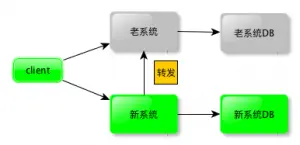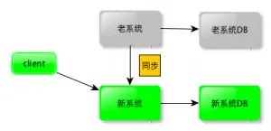 在部分灰度的情况下,有部分请求到旧系统上,另一部分请求到了新的灰度系统上.走到旧系统的请求,还是照原样处理.但是走到了新版灰度系统的请求,需要同时将请求转发给旧系统上来对应的接口上修改旧系统的数据.如果走到新系统的请求查不到该用户的数据,还需要首先同步一份来新系统上.如果是事务性的请求,以写入老系统成功来做为操作成功的标准.