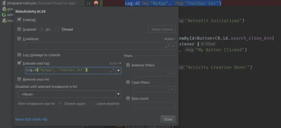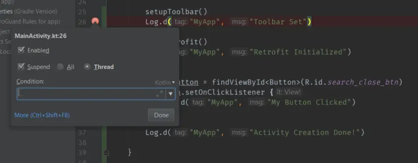首先,单击任意一行代码,创建调试断点。然后你可以通过单击右键弹出编辑断点的对话框。你会看到这个: