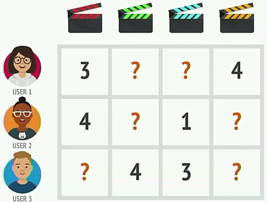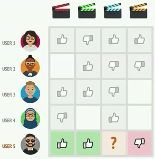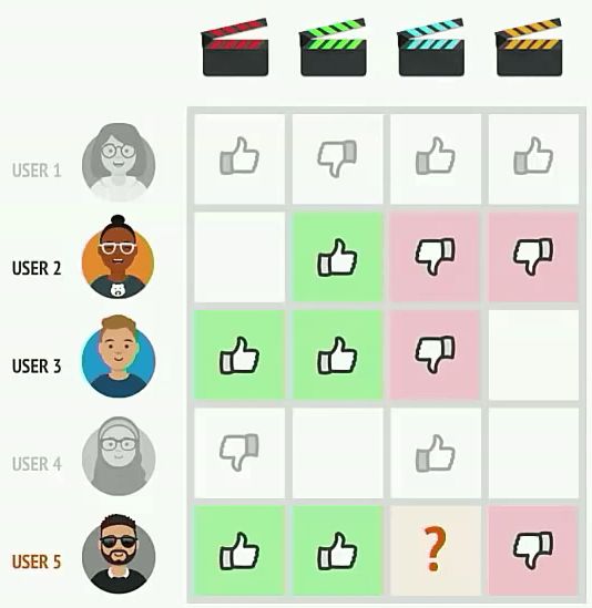 这里有五位用户和四部电影,每个格子中代表用户对某部电影的意见。现在,推荐机制想要猜测用户5对蓝色电影的意见,即