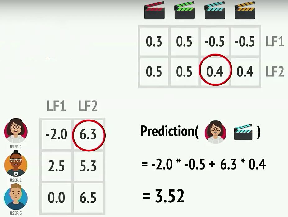 隐性特征的用途主要有两种:预测新分数和进行对比。当我们有了隐性特征,就能随意组合进行预测。例如我们想预测用户1对蓝色电影的看法,就可以进行数量积运算: