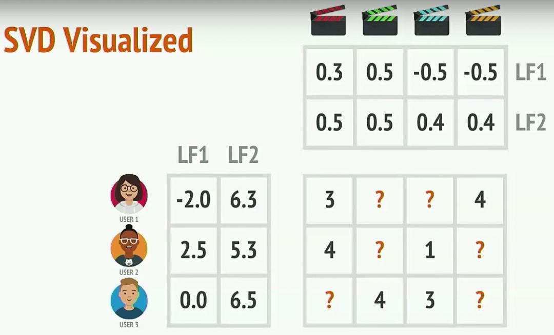 然而这些特征都是由人类定义的,并且是可以看到的。除此之外还有许多看不见的特征,它们在预测评分时非常重要。类似SVD这类的算法可以在数据库中,基于已知的特征,学习生成抽象的、新的特征——隐性特征(latent feature)。隐性特征没有具体的形式,但是可以用于高度信息化的语境中对用户行为进行预测。