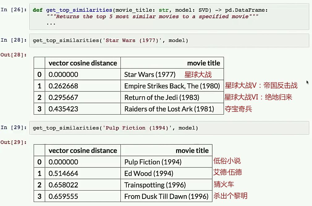 我们知道,如果两个对象之间的余弦距离越接近0,表明二者越相似。这里,我们要评估三部电影之间的相似性——《星球大战》(1977)、《星球大战VI:绝地归来》(1983)和《阿拉丁)(1992)。首先,我们先比较《星球大战》和《星球大战VI:绝地归来》之间的余弦距离,结果是0.296。接着,我们比较《星球大战》和《阿拉丁》之间的余弦距离,结果是0.859。表明《星球大战》和《星球大战VI:绝地归来》之间的相似度更高。这一过程只用到了评分,没有其他任何训练数据。